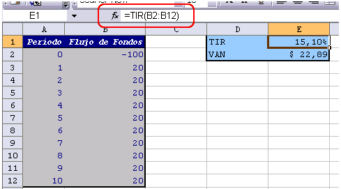 =TIR(matriz que contiene los flujos de caja)Debido a que Excel calcula la TIR mediante un proceso de iteraciones sucesivas, opcionalmente se puede indicar un valor aproximado al cual estimemos que se aproximará la TIR, si no se especifica ningún valor, Excel utilizará 10%.